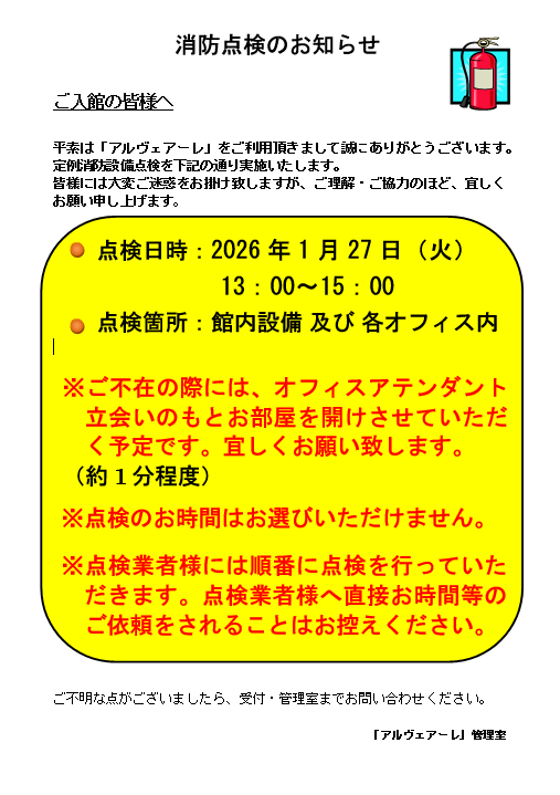 「定期消防点検」のお知らせ♪